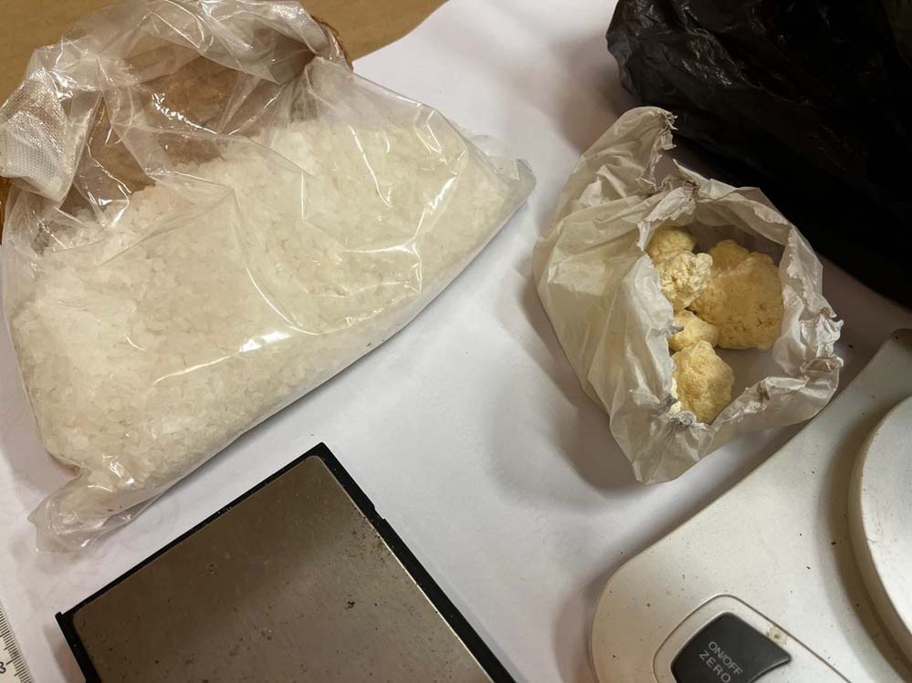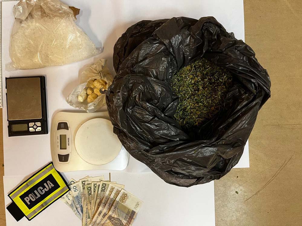 Podczas przeszukania funkcjonariusze znaleźli torbę z suszem roślinnym. Obaj mężczyźni – 34-latek i 29-latek – zostali zatrzymani. W mieszkaniu starszego z nich zabezpieczono kolejne substancje: ponad 400 g marihuany, 100 g amfetaminy i blisko 700 g 3BMC (metabrefedronu).