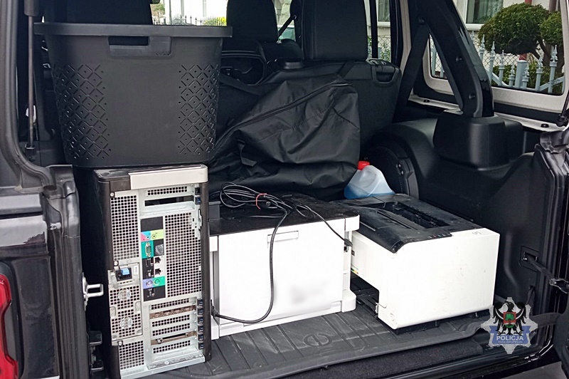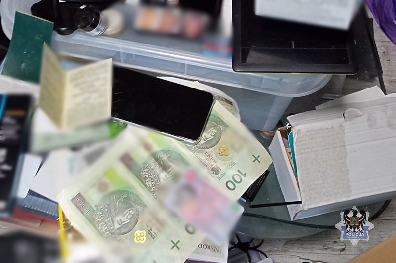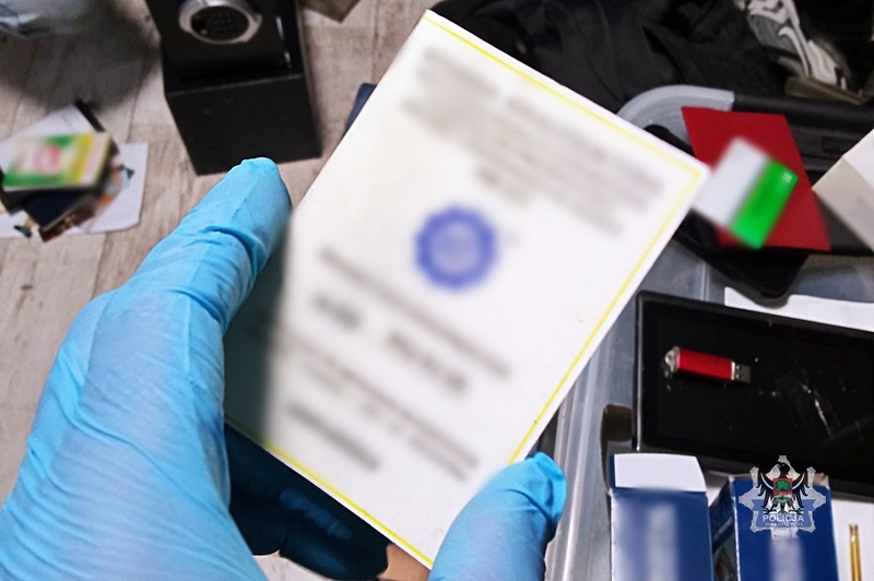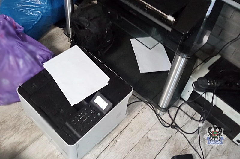Policjanci zabezpieczyli sprzęt komputerowy i biurowy, dokumenty, fragmenty dokumentów, pieczątki ze znakami RP i znakami specjalnymi służące do fałszowania, a także woreczek z zielonym suszem roślinnym – tester potwierdził, że była to marihuana.