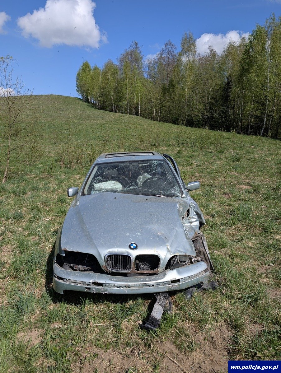 W środę (23.04.2025 r.) około godz. 11:00 oficer dyżurny gołdapskiej policji przyjął zgłoszenie o zdarzeniu drogowym, do którego doszło w Kiepojciach kilka dni wcześniej. Na miejsce interwencji natychmiast pojechali policjanci. W momencie zdarzenia pokrzywdzona przebywała poza miejscem swojego zamieszkania, więc nie posiadała żadnych informacji na temat zaistniałego zdarzenia. Policjanci sprawdzili teren przyległy i niedaleko posesji zauważyli rozbity pojazd marki BMW bez przymocowanych tablic rejestracyjnych. W trakcie prowadzonych czynności do mundurowych zgłosił się mężczyzna, który okazał się być właścicielem pojazdu.