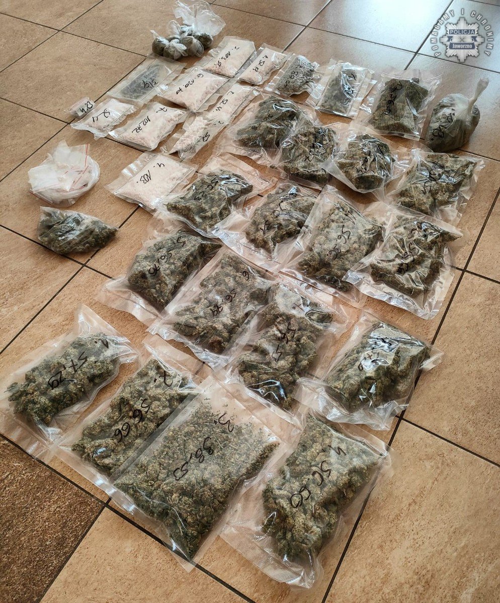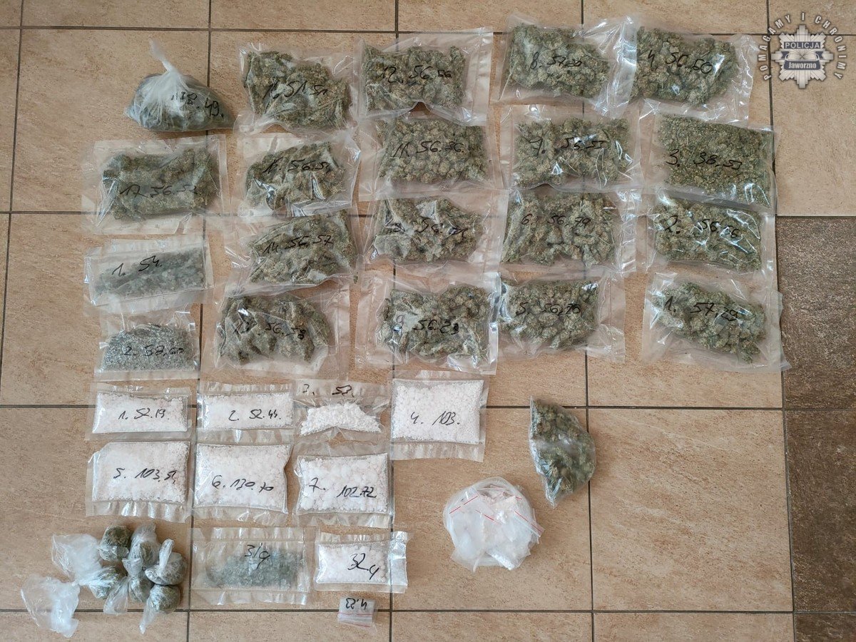 Policjanci wobec 23-latka podjęli czynności i wspólnie z nim udali się do jego miejsca zamieszkania, gdzie ujawnili i zabezpieczyli substancje zabronione w postaci foliowych zawiniątek z suszem roślinnym, białą substancją, woreczków strunowych z krystaliczną substancją oraz gotówkę w kwocie 5400 złotych. Wstępnie wykonane testy potwierdziły, że była to amfetamina, marihuana oraz mefedron. Substancje trafią do laboratorium kryminalistycznego i poddane zostaną badaniom.