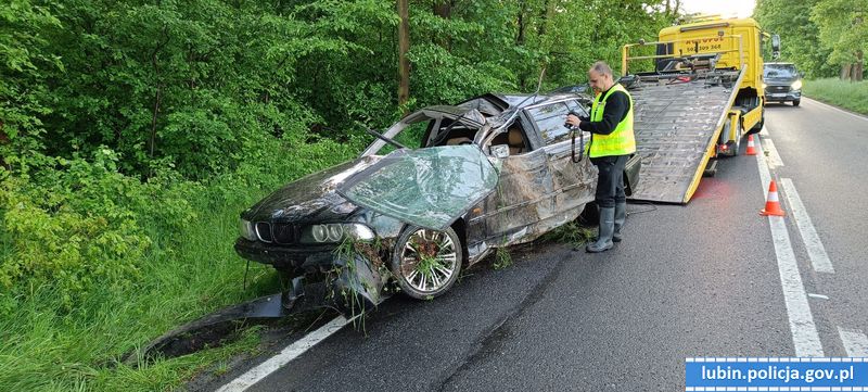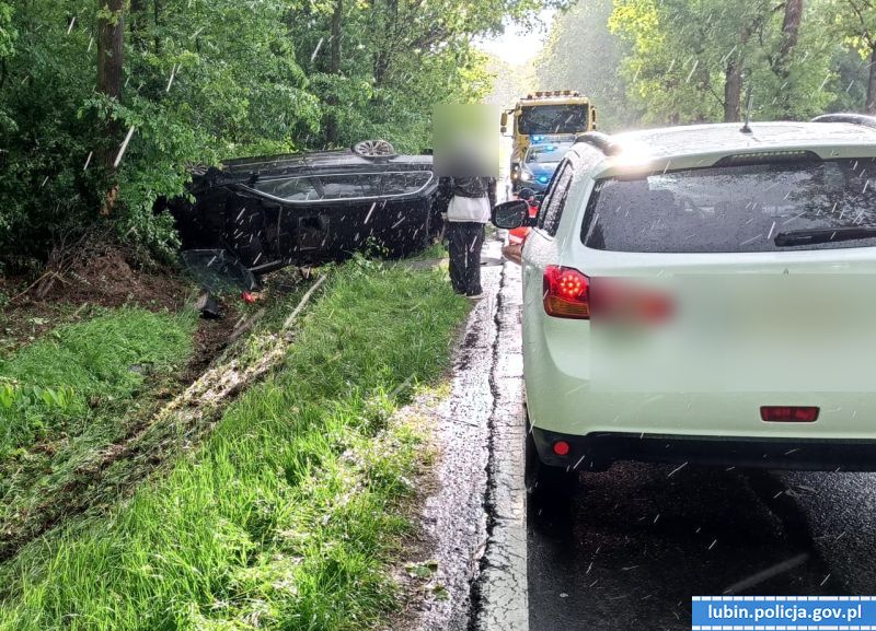 Zdarzenie miało miejsce na trasie Lubin-Ścinawa. Ze wstępnych ustaleń funkcjonariuszy wynika, że kierujący BMW, jadąc w kierunku Lubina, na łuku drogi, w wyniku niedostosowania prędkości do warunków ruchu, stracił panowanie nad pojazdem i przecinając przeciwległy pas ruchu, zjechał do przydrożnego rowu. Na szczęście obrażenia ciała kierującego i jego pasażerów nie zagrażały życiu i zdrowiu. Kierujący BMW był trzeźwy.