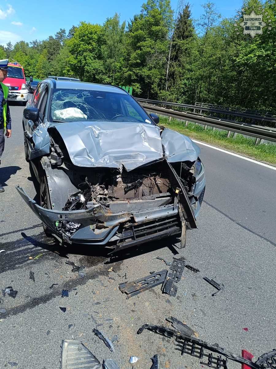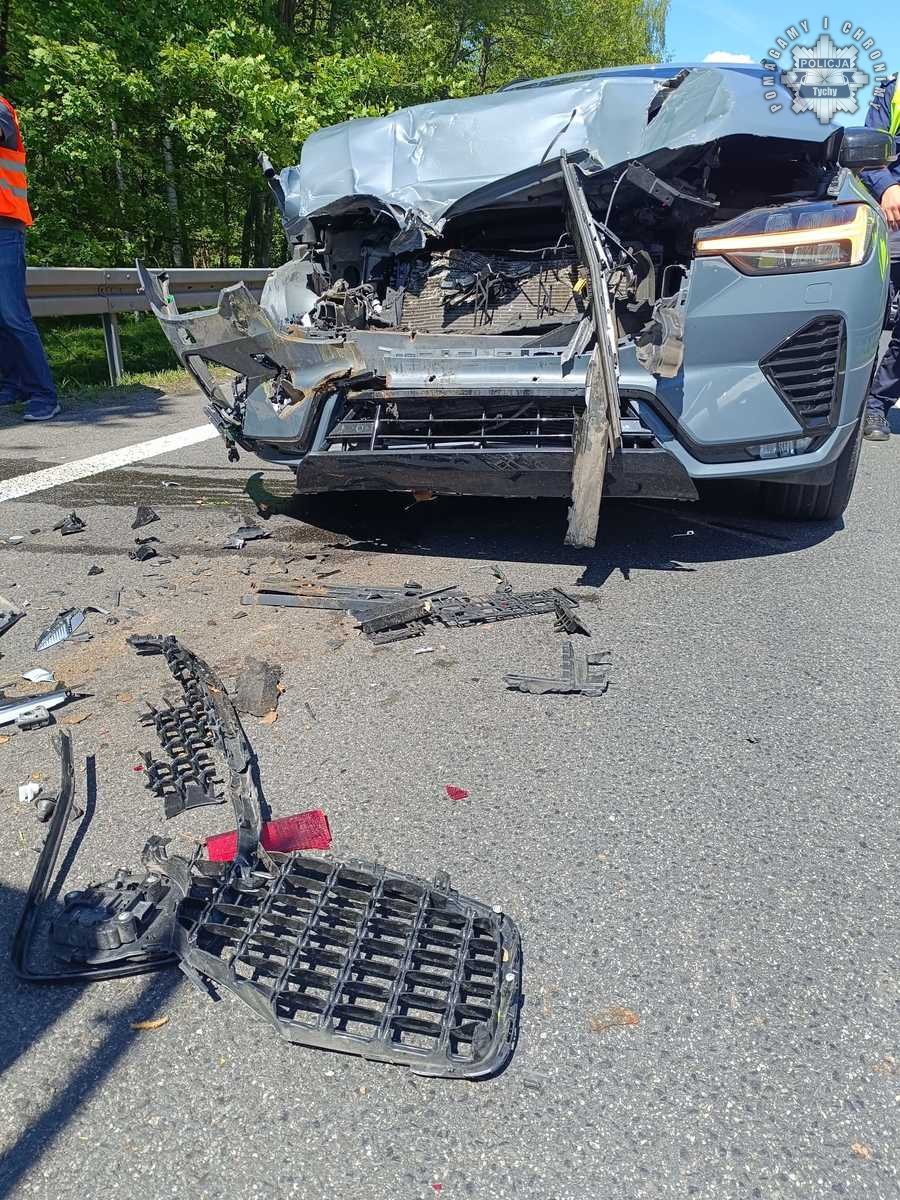 Z ustaleń wynika, że 35-letni kierowca volvo, mieszkaniec Góry, nie zachował ostrożności podczas omijania i uderzył w tył dostawczego renaulta, zabezpieczającego prace porządkowe na pasie drogowym. Siła zderzenia była tak duża, że renault przemieścił się i potrącił 49-letnią kobietę wykaszającą trawę. Poszkodowana z obrażeniami nóg trafiła do szpitala w Tychach.
