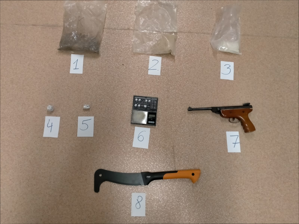 Podczas przeszukania mieszkania zajmowanego przez zatrzymanych, policjanci zabezpieczyli blisko 650 gramów marihuany i 4CMC. Znaleźli też przedmioty przypominające broń palną, maczetę oraz gotówkę w wysokości 8 tysięcy złotych, którą zabezpieczono na poczet przyszłych kar.