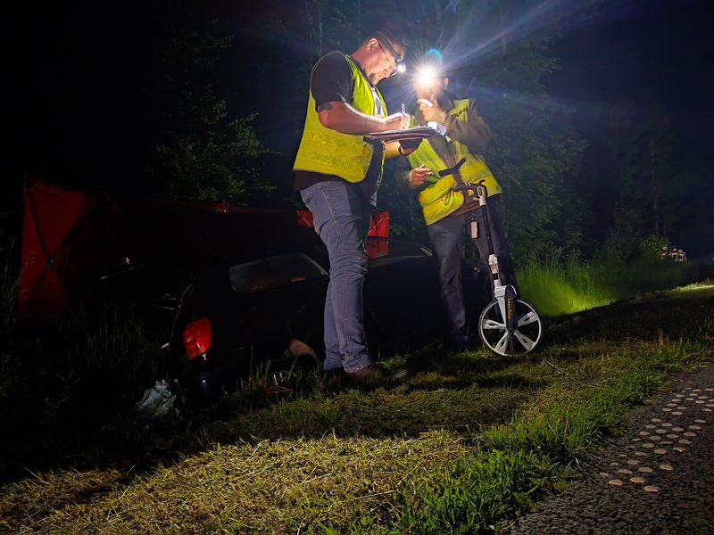 Na miejscu pracowali policjanci i prokurator. Przeprowadzono oględziny, zabezpieczono ślady i przesłuchano świadków. Trwa szczegółowe wyjaśnianie okoliczności wypadku pod nadzorem prokuratury. Ciało kierowcy volkswagena zabezpieczono do sekcji zwłok, a oba pojazdy trafiły do dalszych badań procesowych.
