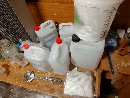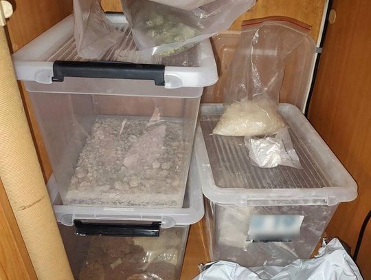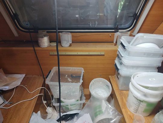 W miniony poniedziałek (2 czerwca 2025 r.) funkcjonariusze zastali tam podejrzanego. Ich uwagę przyciągnęła zaparkowana na terenie posesji przyczepa kempingowa, która – jak się okazało – służyła jako nielegalne laboratorium. W jej wnętrzu znajdowały się specjalistyczne pojemniki, kuwety, odczynniki chemiczne oraz inne akcesoria służące do produkcji i przetwarzania narkotyków. Policjanci zabezpieczyli ponad 5,3 kilograma różnego rodzaju substancji odurzających i psychotropowych o czarnorynkowej wartości blisko 300 tysięcy złotych.