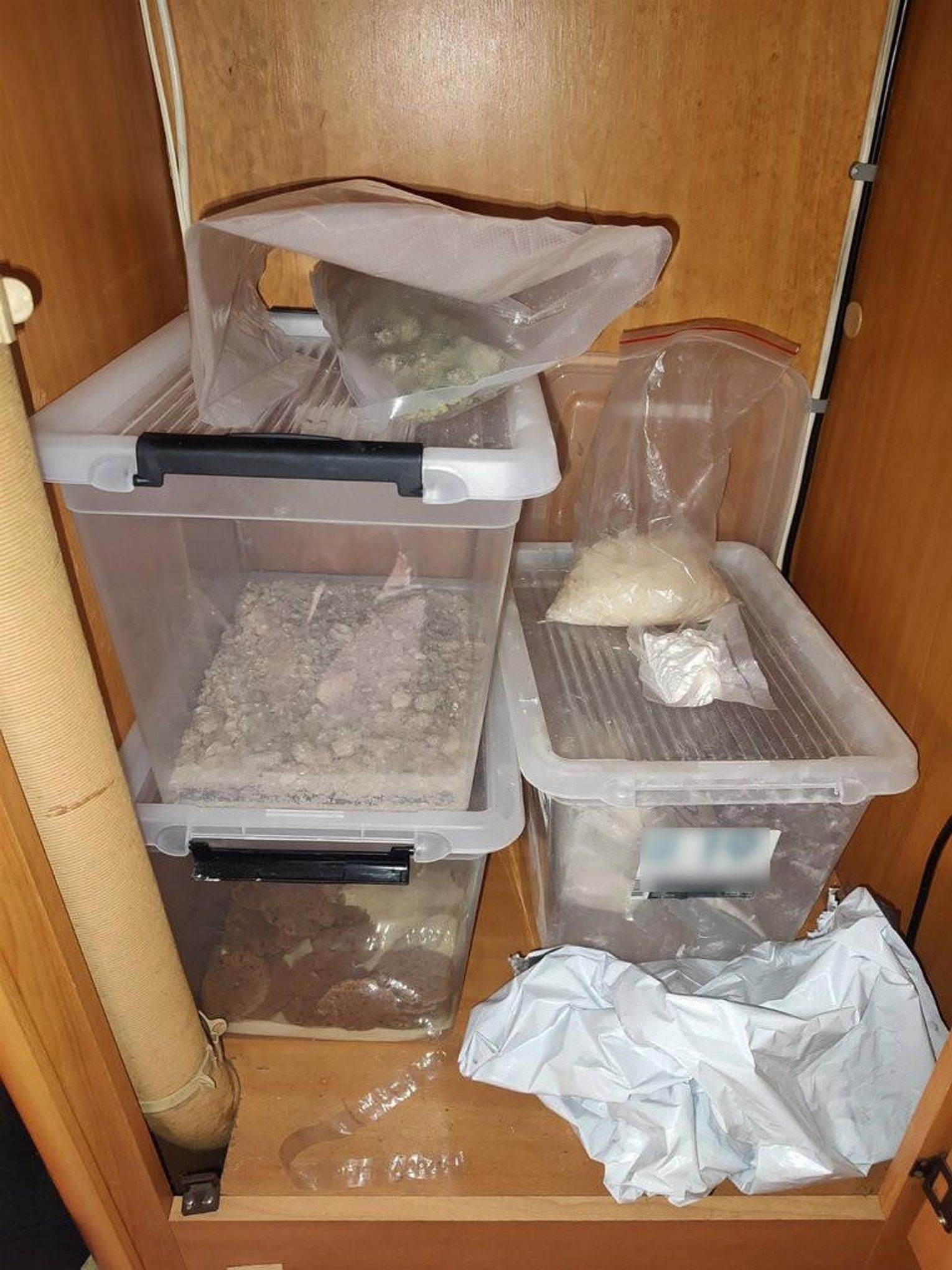 Wśród zabezpieczonych środków znajdowało się: ponad 2,5 kilograma amfetaminy, blisko 1,5 kilograma kryształu 3CMC, 165 gramów marihuany, 70 gramów kokainy, pół kilograma ciastek z THC, 440 gramów plastycznej substancji oraz 78 butelek (łącznie 7,8 litra) płynu zawierającego THC. Wstępne badania potwierdziły, że są to substancje zakazane na mocy ustawy o przeciwdziałaniu narkomanii. Całość została przekazana do dalszych analiz w policyjnym laboratorium.