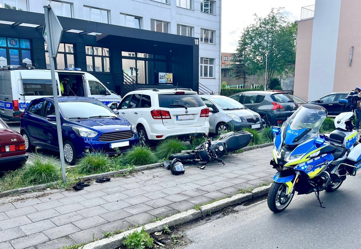 W poniedziałkowe popołudnie funkcjonariusze Wydziału Ruchu Drogowego, patrolujący miasto na motocyklach, próbowali zatrzymać do kontroli kierującego Hondą. Mężczyzna jednak zignorował sygnały świetlne i dźwiękowe, rozpoczynając niebezpieczną ucieczkę. Jechał z nadmierną prędkością, łamał przepisy – m.in. wyprzedzał na skrzyżowaniach, przejeżdżał na czerwonym świetle i niemal potrącił pieszego. Po kilkuset metrach stracił panowanie nad motocyklem, wjechał na chodnik i uderzył w dwa zaparkowane auta.