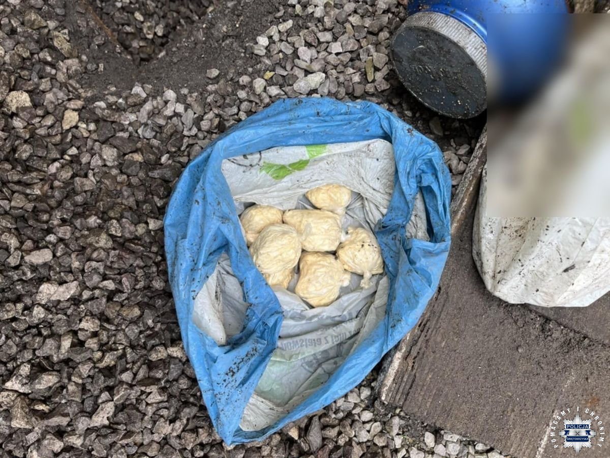 Policjanci z Kielc, prowadząc działania operacyjne, ustalili, że 41-latka może posiadać znaczne ilości środków odurzających. Dotarli na jedną z posesji na terenie gminy Jędrzejów, gdzie znajduje się lokal usługowy. Podczas przeszukania trafili na ukrytą w ziemi skrytkę – deski przykryte warstwą drobnego kamienia maskowały plastikowy pojemnik, w którym znajdowały się 31 zawiniątka z białym proszkiem. Wstępne testy wykazały, że to amfetamina.