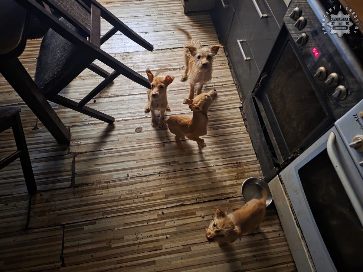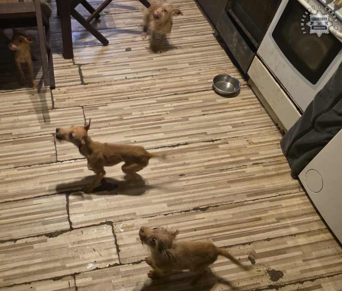 Policjanci z Komendy Miejskiej Policji w Jaworznie, po otrzymaniu zgłoszenia, przeprowadzili kontrolę w jednym z mieszkań przy ul. Koszarowej. Na miejscu zastali przerażający widok – osiem skrajnie wychudzonych i zaniedbanych psów, w tym sześć szczeniąt, przebywało w pomieszczeniach pełnych odchodów. Zwierzęta były brudne, głodne i odruchowo ssały palce funkcjonariuszy. W mieszkaniu nie było jedzenia ani misek, a – jak ustalono – psy nie były wyprowadzane, a lokal był miejscem regularnych libacji alkoholowych.