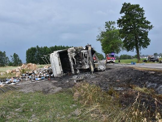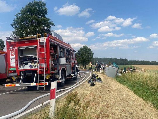 Do groźnego wypadku doszło w poniedziałek, po godzinie 13:00, na drodze wojewódzkiej nr 811 w miejscowości Hrud. Jak wynika ze wstępnych ustaleń policjantów, 66-letni kierowca jeepa z nieustalonych przyczyn zjechał na przeciwległy pas ruchu i zderzył się z ciężarową scanią, którą prowadził 24-latek. W wyniku zderzenia ciężarówka przewróciła się i stanęła w ogniu.