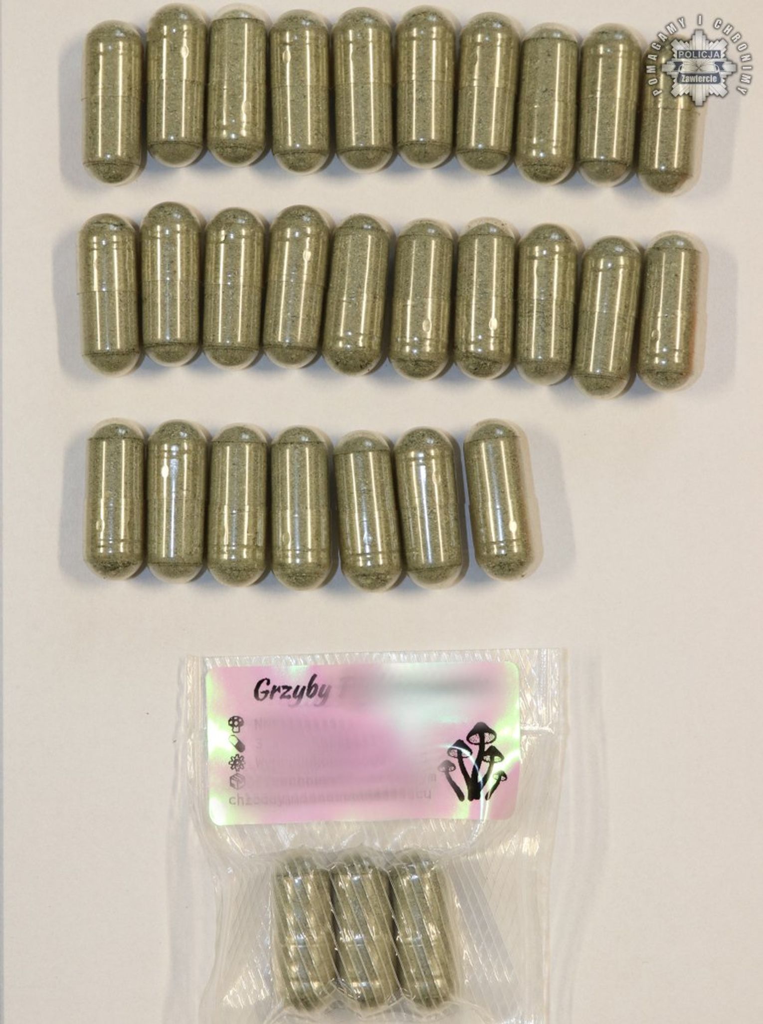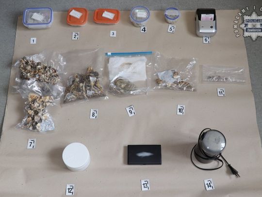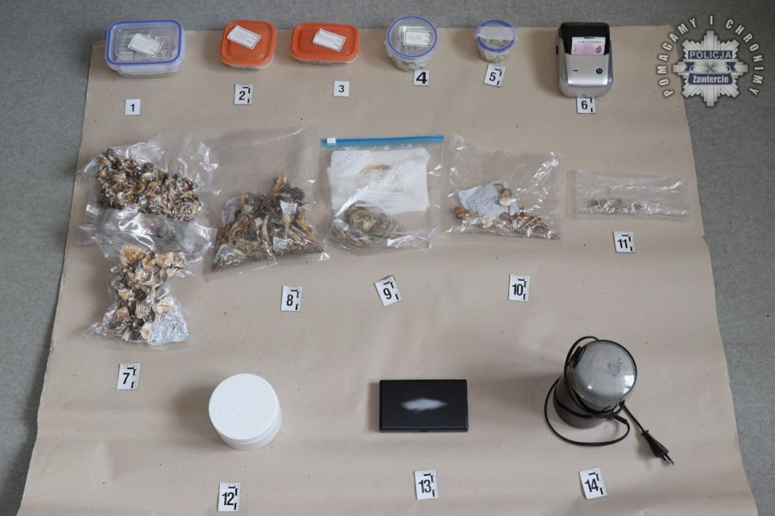 Dalsze czynności prowadzone przez zawierciańskich kryminalnych doprowadziły do przeszukania mieszkania 26-latka. Tam ujawniono nielegalną uprawę grzybów halucynogennych oraz sprzęt wykorzystywany do produkcji znacznych ilości substancji psychotropowych. Policjanci zabezpieczyli 165 kapsułek zawierających substancję psychoaktywną oraz ponad ćwierć kilograma grzybów z zawartością substancji zabronionej.