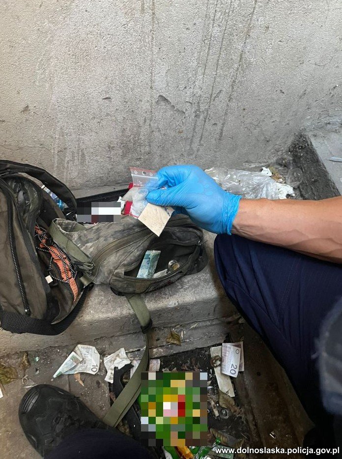 W trakcie sprawdzania danych zatrzymanego 41-letniego wrocławianina okazało się, że nie posiada on uprawnień do kierowania pojazdami oraz obowiązuje go sądowy zakaz prowadzenia. Policjanci zabezpieczyli porzucone saszetki, w których znajdowały się m.in. kominiarka, scyzoryk, woreczki z suszem roślinnym, skrystalizowaną substancją i brunatnym proszkiem, a także broń czarnoprochowa z nabitym sześciokomorowym bębenkiem.