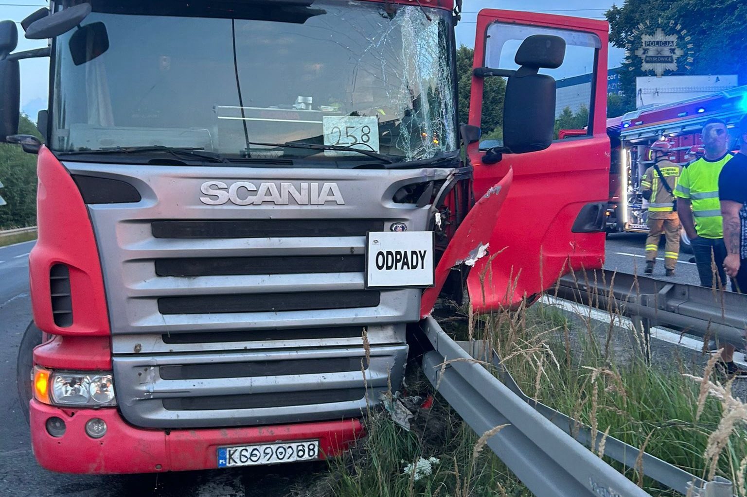 Ze wstępnych ustaleń wynika, że w ciągniku siodłowym doszło do wystrzału lewej przedniej opony. Kierowca ciężarówki stracił panowanie nad pojazdem i uderzył w jadącą lewym pasem skodę, spychając ją na bariery energochłonne. Siła zderzenia była tak duża, że osobówka przemieściła się przez barierki i dachowała na przeciwległym pasie w kierunku Tychów.