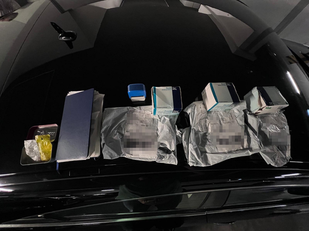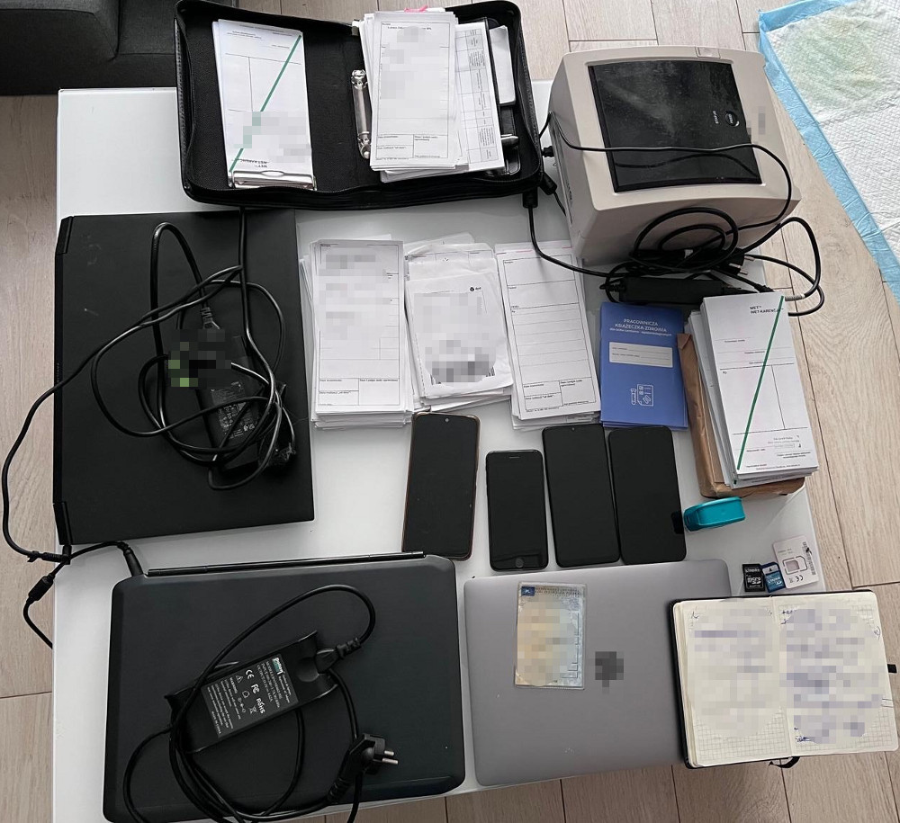 Podczas przeszukania jego mieszkania policjanci zabezpieczyli liczne przedmioty mogące służyć do popełniania przestępstw, w tym laptopy, telefony komórkowe, drukarki, pieczątki lekarskie, niepodpisane druki recept, książeczki zdrowia oraz karty SIM różnych operatorów. Znaleziono również kilkadziesiąt wypisanych recept z danymi placówek medycznych i lekarzy, a także notatniki z zapiskami, bloczki zaświadczeń i puste etykiety receptowe.