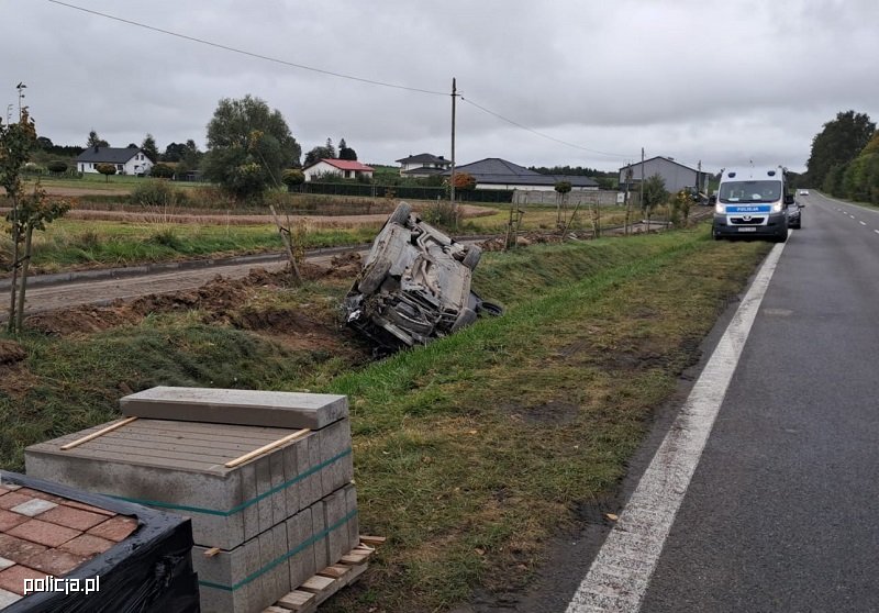 Do zdarzenia doszło w poniedziałek, 6 października, po godzinie 10:00, na trasie między Krępą Kaszubską a Darżkowem w gminie Nowa Wieś Lęborska. Jak ustalili funkcjonariusze, audi dachowało po tym, jak kierowca stracił panowanie na łuku drogi, zjechał na przeciwny pas, uderzył w paletę z kostką brukową i wpadł do rowu.