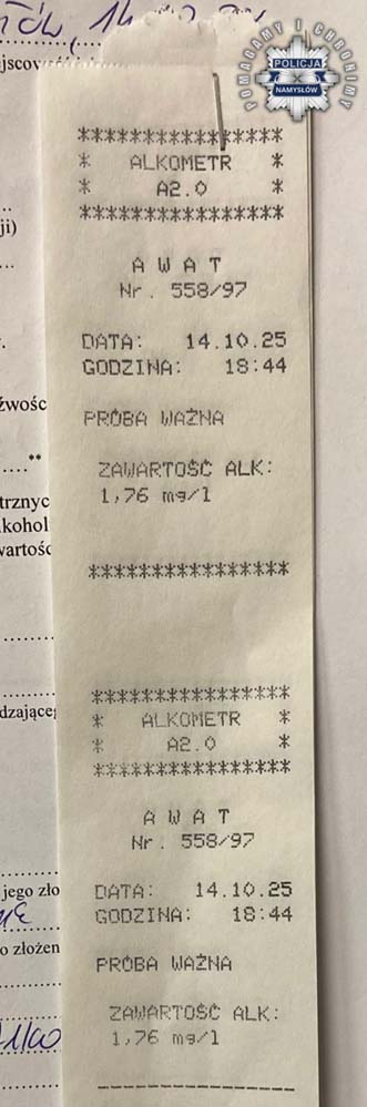 Mężczyzna został zatrzymany i przewieziony do komendy w Namysłowie. Samochód, którym się poruszał, trafił na parking, a dalsze czynności prowadzą śledczy.