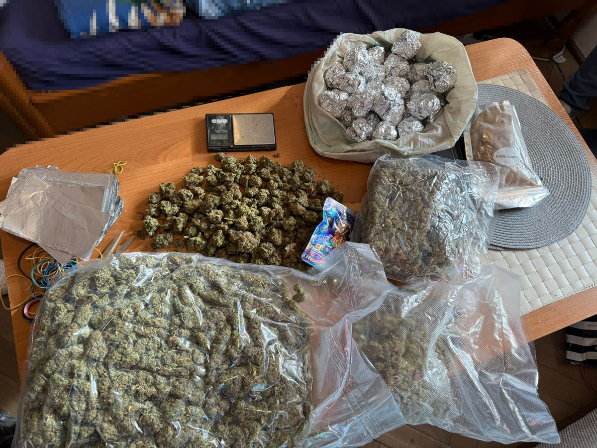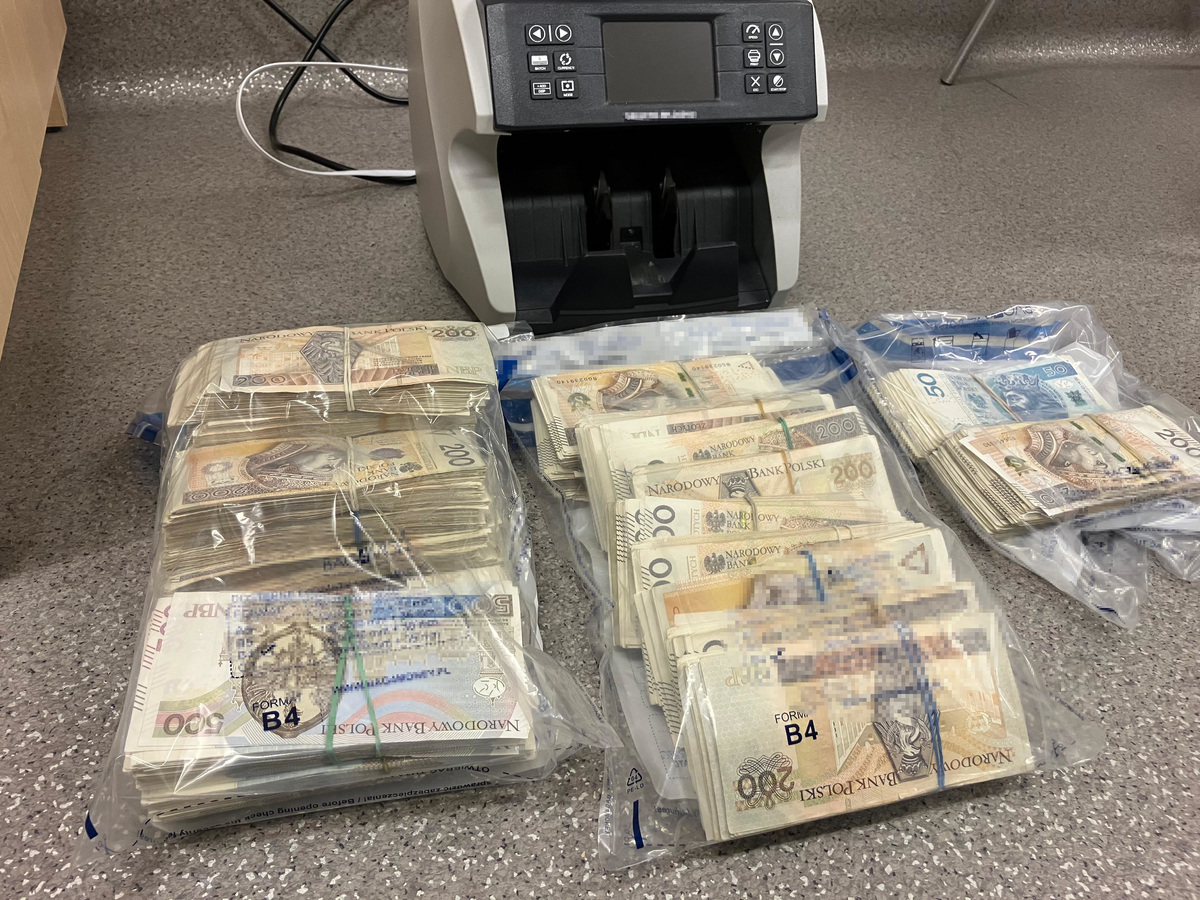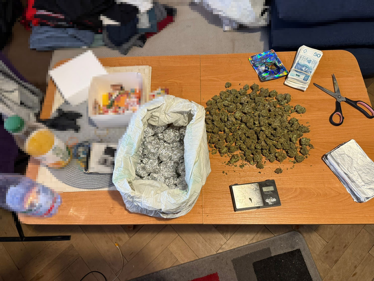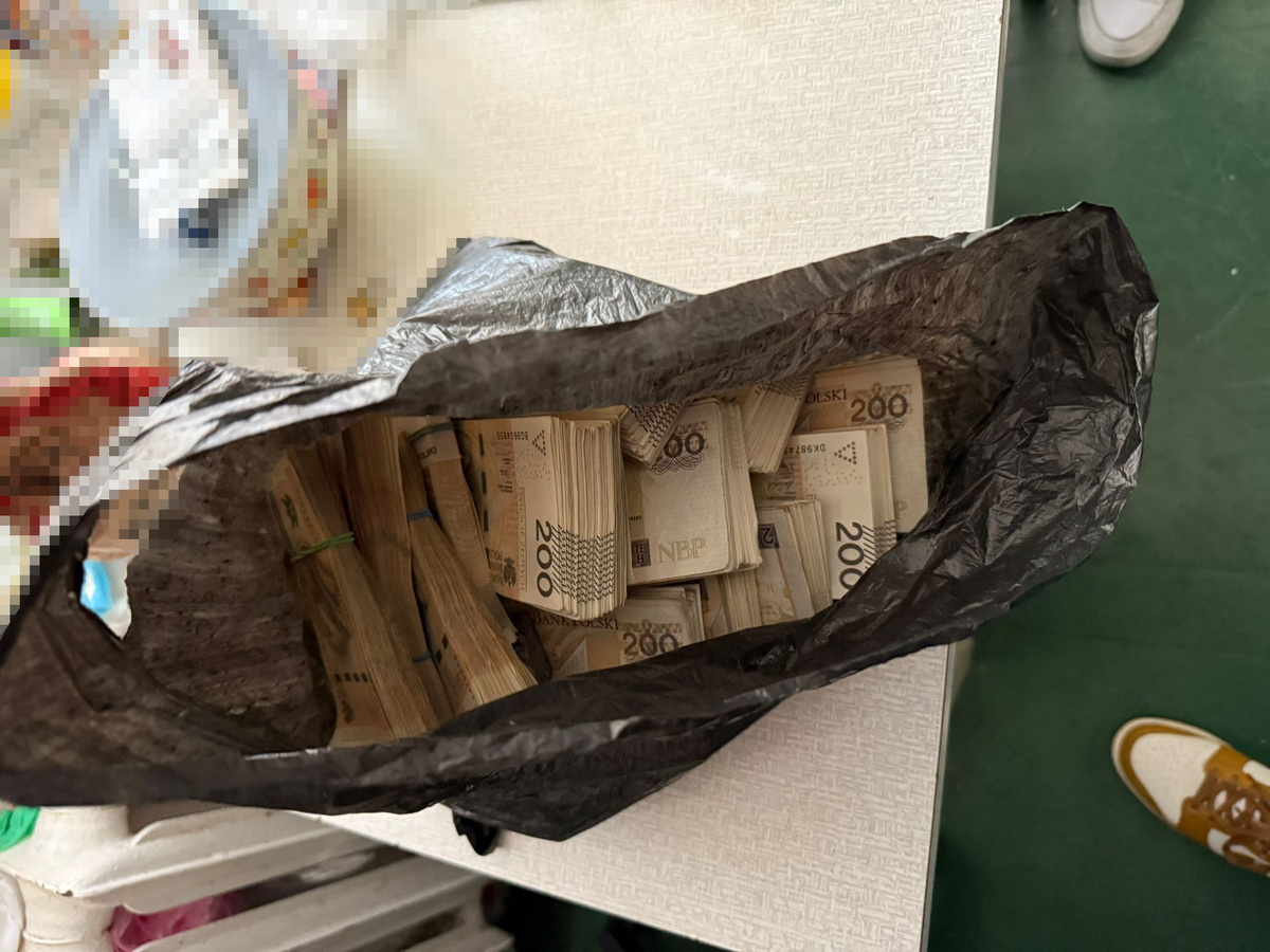Gdy funkcjonariusze weszli do mieszkania, zastali zaskoczoną 54-letnią żonę mężczyzny. W środku policjanci znaleźli niemal dwa kilogramy marihuany, ponad 500 tysięcy złotych w gotówce oraz sprzęt służący do porcjowania i pakowania narkotyków. Z ustaleń śledczych wynika, że kobieta współuczestniczyła w narkotykowym procederze, a zabezpieczone pieniądze pochodziły ze sprzedaży środków odurzających.