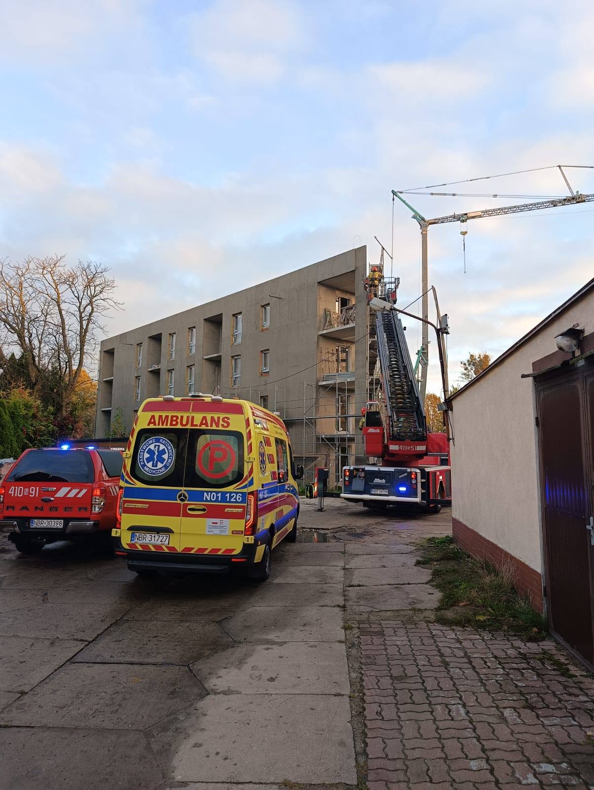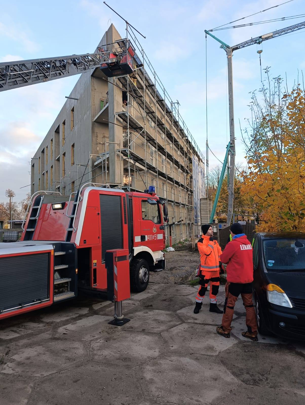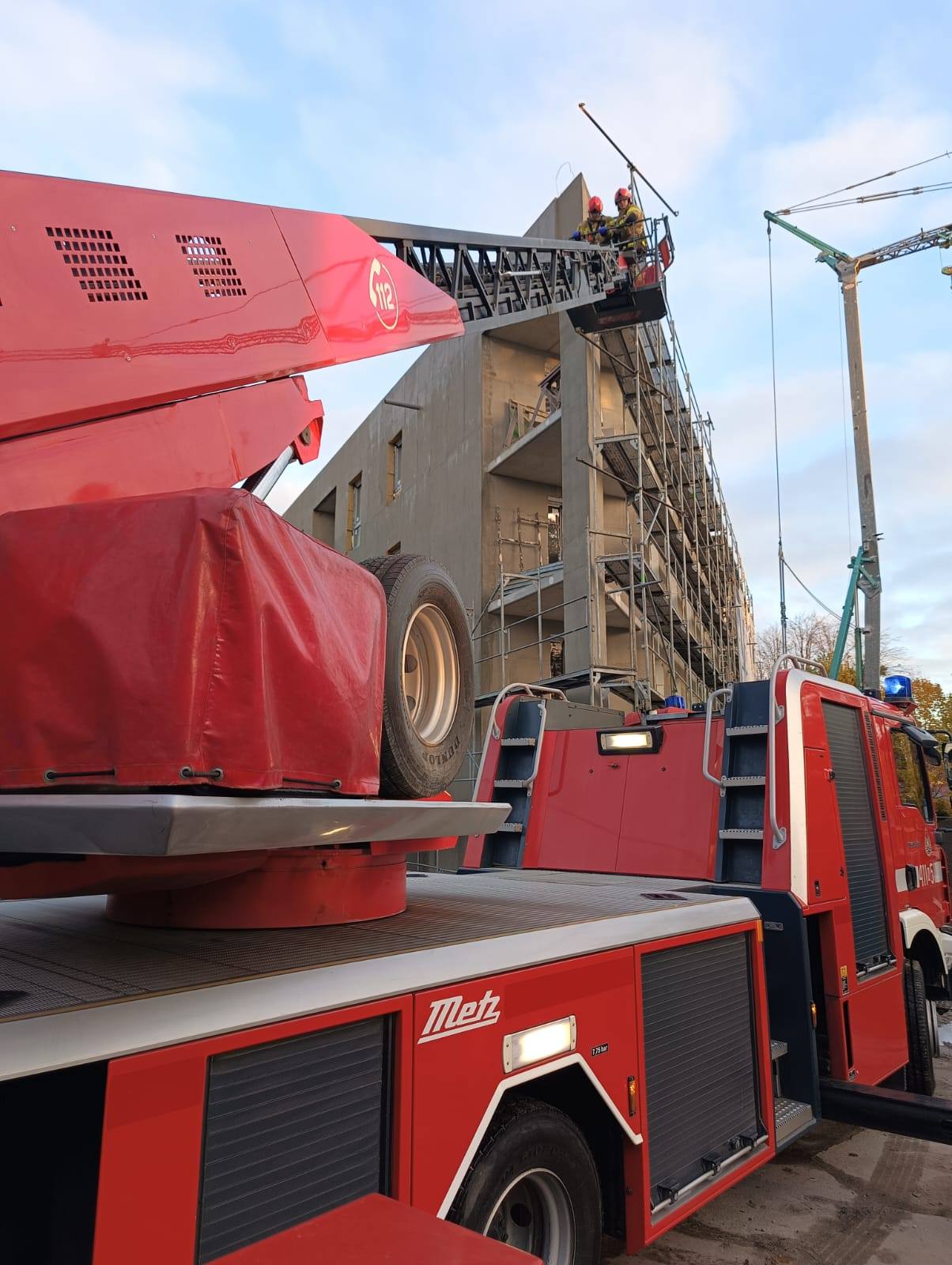 Po przybyciu na miejsce zdarzenia strażacy zlokalizowali mężczyznę na czwartej kondygnacji budowanego obiektu. Znajdował się on w przestrzeni pomiędzy rusztowaniem a ścianą budynku. Ratownicy PSP dostali się do niego z użyciem autodrabiny pożarniczej, a także wchodząc po konstrukcji rusztowania znajdującej się na ścianie.