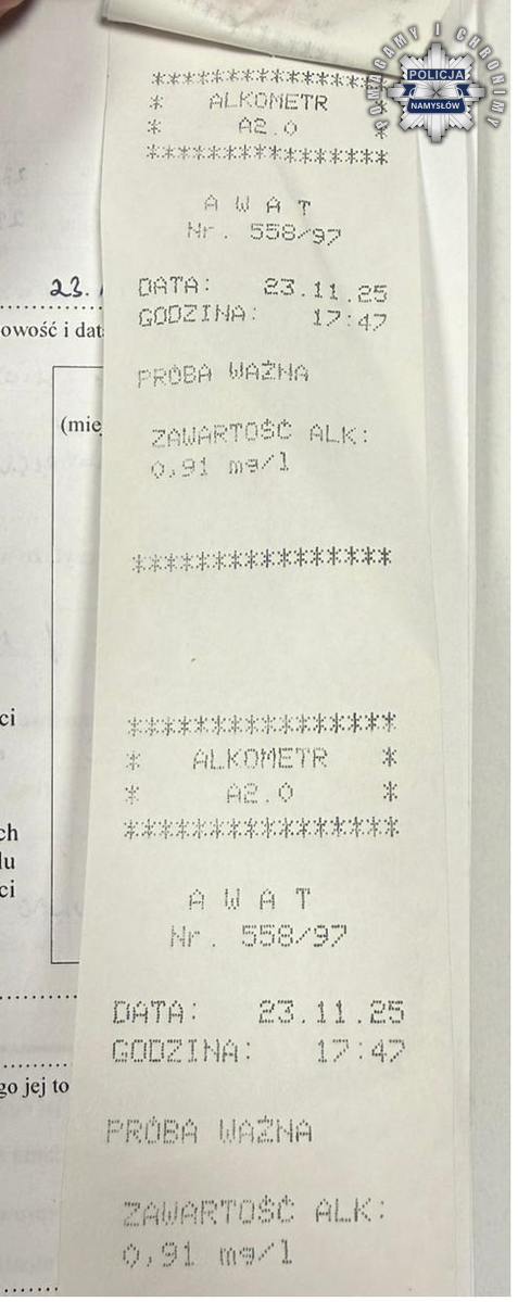 Badanie alkomatem potwierdziło stan nietrzeźwości. Sprawdzenie w policyjnych systemach wykazało również, że mężczyzna nie posiada prawa jazdy. Zatrzymany został przewieziony do komendy, a jego samochód zabezpieczono na parkingu strzeżonym. Po wytrzeźwieniu wykonano z nim czynności procesowe.