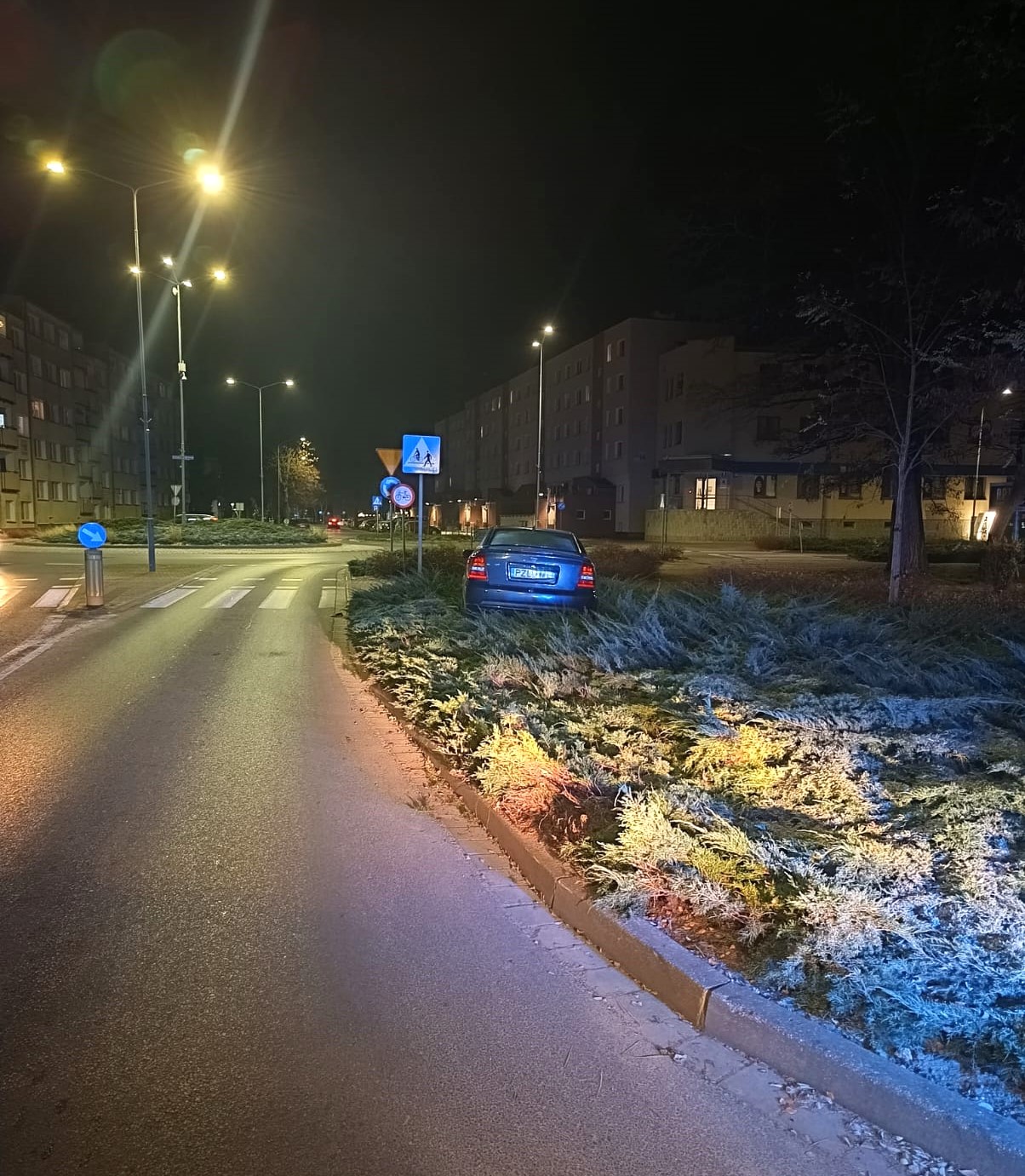 Do interwencji doszło po godzinie 20:00, gdy policja otrzymała zgłoszenie o pojeździe, który zjechał z drogi i zatrzymał się na zieleńcu w pobliżu ronda im. Jana Pawła II. Na miejscu funkcjonariusze zastali kierowcę oraz jego pasażerkę stojących obok samochodu. Jak przyznał 20-latek, niedostosował prędkości do warunków ruchu i nie zdążył zahamować, ponieważ sięgał do schowka w aucie. Był trzeźwy, a żadna osoba nie odniosła obrażeń.