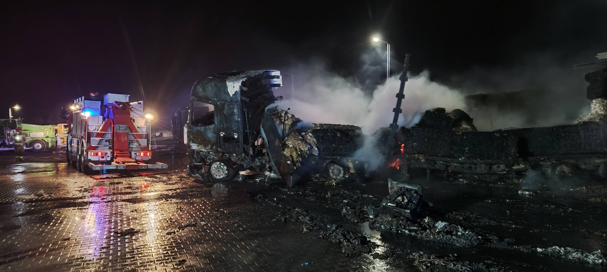 Po przybyciu pierwszych jednostek okazało się, że ogniem objęte są zestawy transportowe, w tym ciągniki siodłowe z naczepami. W wyniku pożaru sześć zestawów spłonęło całkowicie, jeden uległ nadpaleniu, a także nadpaleniu uległ samochód dostawczy. Na szczęście w zdarzeniu nikt nie ucierpiał.