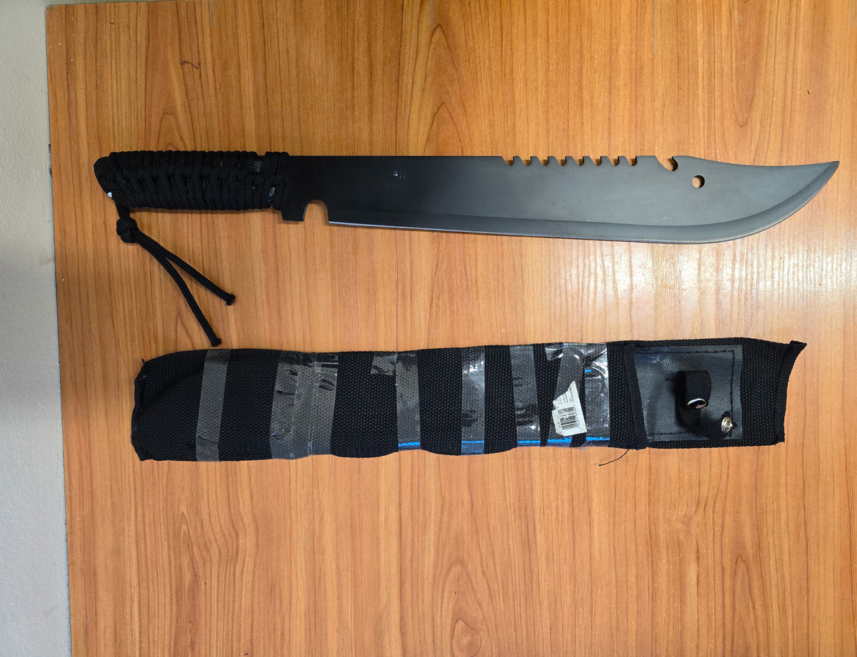 Policjanci rozpoczęli poszukiwania mężczyzny. W trakcie penetracji terenu zauważyli 43-latka w garażu podziemnym jednego z budynków. Był wyraźnie zaskoczony widokiem funkcjonariuszy. Podczas czynności policjanci ujawnili w jego plecaku nóż typu maczeta.