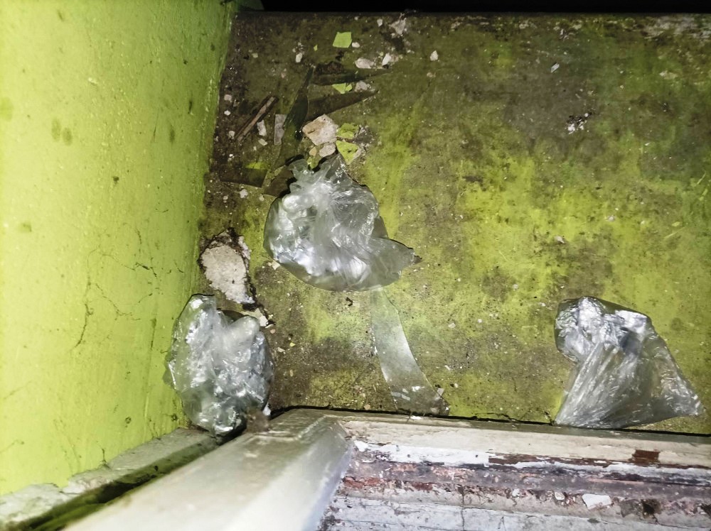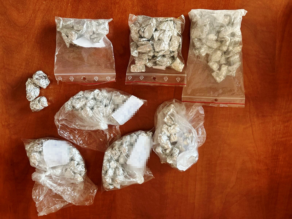 Podczas działań policjanci zabezpieczyli od podejrzanego telefon komórkowy oraz prawie 4 tysiące złotych, a w pierwszym podwórzu znaleziono ukryte w śniegu pojemniki z foliowymi zawiniątkami zawierającymi biały i beżowy proszek, susz roślinny oraz zbryloną białą substancję. Przeszukanie przeprowadzono z udziałem przewodnika z psem wyszkolonym do wykrywania zapachu narkotyków. W wyniku oględzin w komendzie przy ul. Jagiellońskiej potwierdzono, że zabezpieczone środki to heroina, mefedron, marihuana, amfetamina oraz tabletki Tramalu i Linefor.