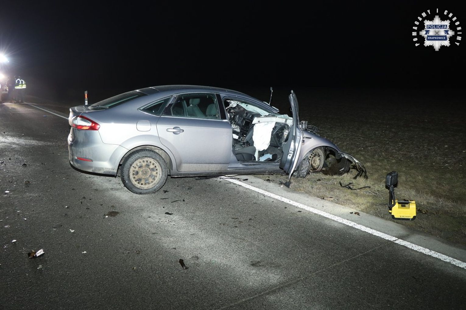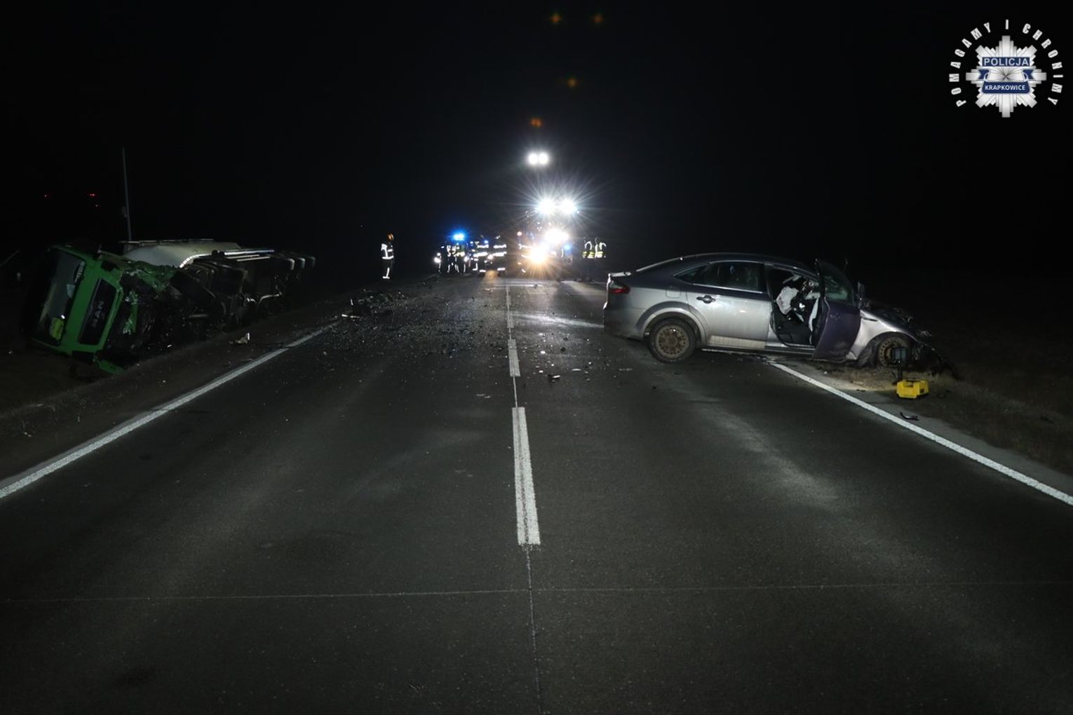 Do wypadku doszło w czwartek, 29 stycznia 2026 roku, tuż przed godziną 1:00, na odcinku obwodnicy pomiędzy miejscowościami Chorula i Gogolin. Jak wynika ze wstępnych ustaleń funkcjonariuszy Komendy Powiatowej Policji w Krapkowicach, kierujący samochodem osobowym marki Ford z niewyjaśnionych dotąd przyczyn poruszał się środkiem jezdni, a następnie zjechał na przeciwległy pas ruchu.