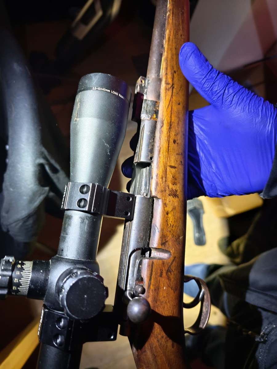 Interwencja policjantów przybrała nieoczekiwany obrót. Podczas wyjaśniania okoliczności pobicia, mundurowi zauważyli w domku przedmiot przypominający broń palną. Dokładne przeszukanie lokalu ujawniło broń długą wyposażoną w lunetę, 477 sztuk amunicji różnego kalibru i ponad 320 gramów marihuany (ziela konopi innych niż włókniste). Do sprawy zatrzymano trzy osoby: dwie kobiety (w wieku 29 i 50 lat) oraz 29-letniego obywatela Słowacji.