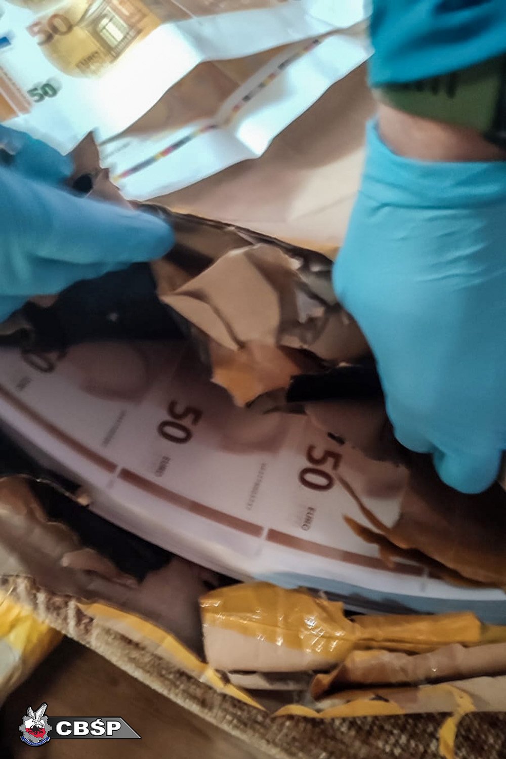 W mieszkaniu policjanci natrafili na nietypowe znalezisko. Zabezpieczono ponad 800 arkuszy, na których nadrukowane były banknoty o nominale 50 euro. Po przeliczeniu okazało się, że z tej ilości materiału można by uzyskać ponad 13 tysięcy gotowych banknotów. Choć na miejscu nie odnaleziono maszyn służących do produkcji, sama ilość zabezpieczonych arkuszy świadczy o ogromnej skali procederu. Cały materiał dowodowy trafił do biegłych, którzy poddadzą go szczegółowym ekspertyzom.