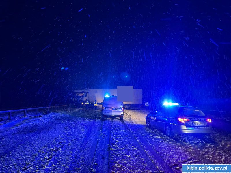 Do zdarzenia doszło 18 lutego, przed godziną 4.00. Jak informuje Komenda Powiatowa Policji w Lubinie, na drodze ekspresowej S3 kierujący samochodem ciężarowym wraz z naczepą, w trudnych warunkach pogodowych i na śliskiej nawierzchni, stracił panowanie nad pojazdem, uderzył w bariery energochłonne i zatrzymał się w poprzek drogi. Utrudnienia w ruchu trwały kilka godzin.