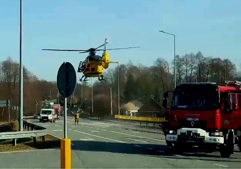 W wyniku zderzenia samochód mężczyzny został wybity z toru jazdy, przejechał przez barierki ochronne, wjechał do przydrożnego rowu i dachował. Zgłoszenie o zdarzeniu zostało automatycznie wysłane przez telefon jednego z kierujących, dlatego na miejsce zadysponowano śmigłowiec Lotniczego Pogotowia Ratunkowego. Ostatecznie zdarzenie zakwalifikowano jako kolizję drogową.