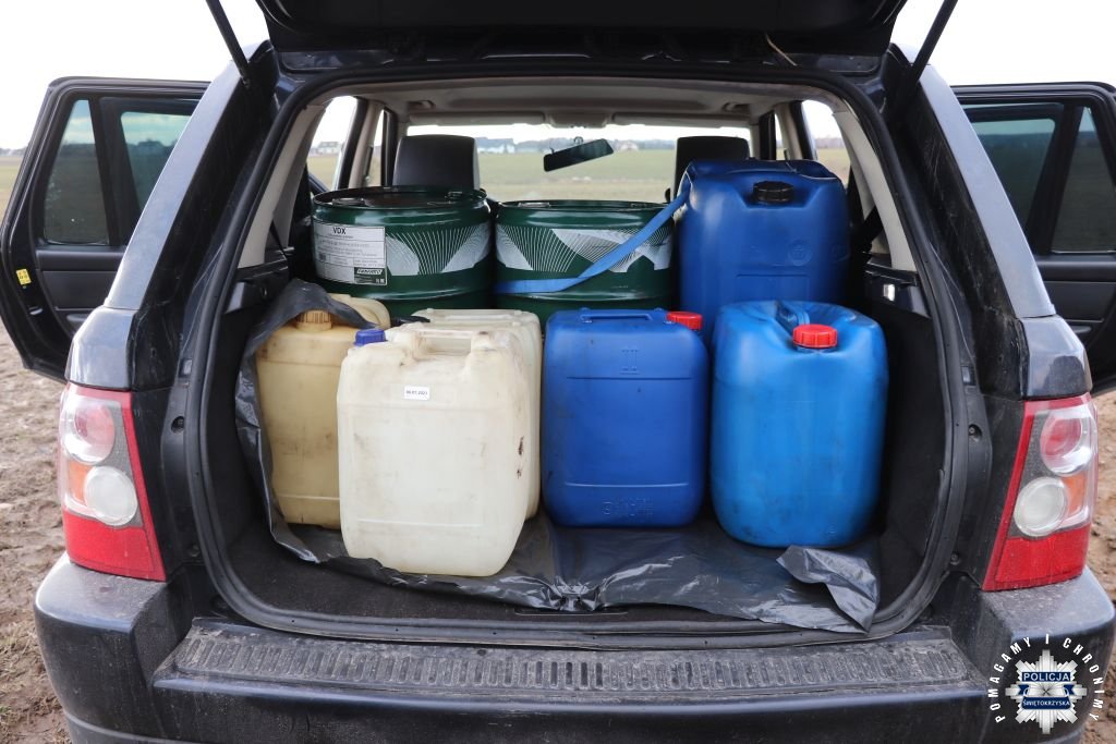 To był jednak dopiero początek znalezisk. W bagażniku i wnętrzu auta policjanci odkryli kilka zbiorników wypełnionych paliwem o łącznej pojemności około 300 litrów, kolejne tablice rejestracyjne pochodzące z innego pojazdu, które posłużyły do kradzieży paliwa na terenie województwa łódzkiego.