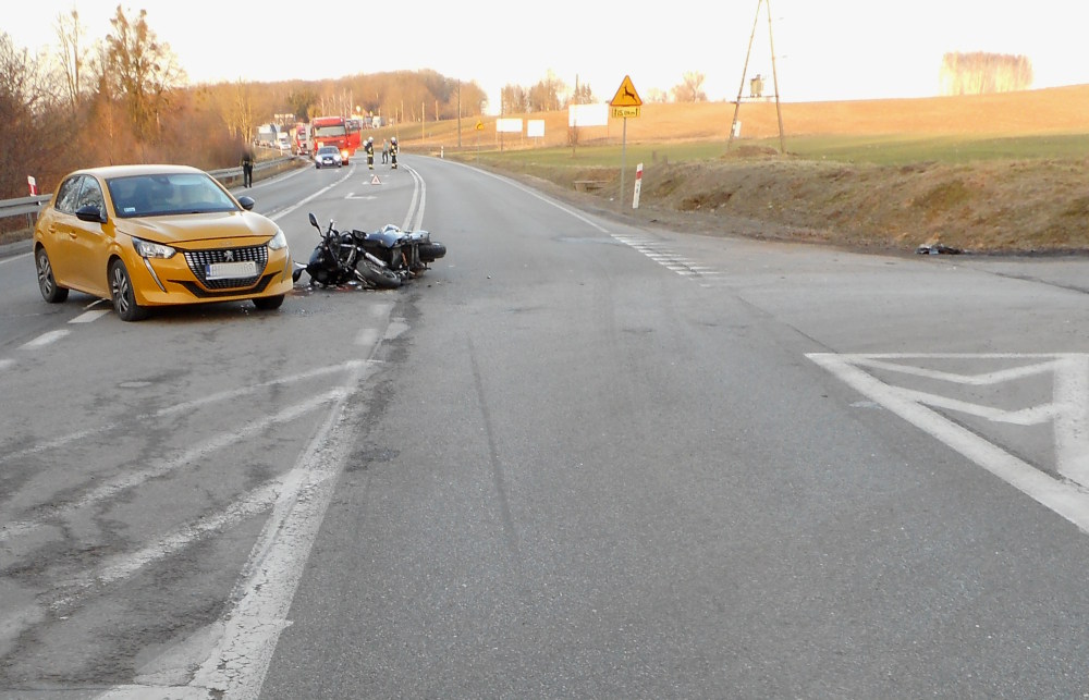 Do zdarzenia doszło we wtorek, 3 marca kilka minut po godzinie 15:00 na odcinku drogi krajowej nr 16 w powiecie iławskim. Jak wynika z policyjnych ustaleń, 33-letnia kobieta siedząca za kierownicą Peugeota wyjeżdżała z drogi podporządkowanej. Podczas próby włączenia się do ruchu, mieszkanka gminy Iława nie ustąpiła pierwszeństwa przejazdu prawidłowo jadącemu motocykliście. Siła uderzenia była na tyle duża, że zarówno 33-latka, jak i kierujący jednośladem musieli zostać przetransportowani do szpitala.