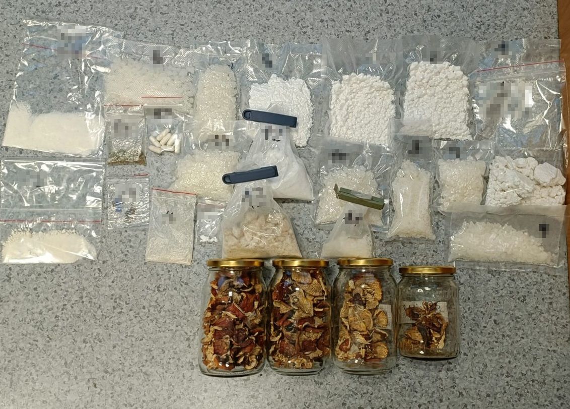 Podczas przeszukania zabezpieczono m.in. worki foliowe z proszkiem i substancjami krystalicznymi, kapsułki, paski nasączone substancją, susz marihuany oraz słoiki z grzybami zawierającymi środki zabronione. Mundurowi znaleźli również papierosy bez polskich znaków akcyzy, wagi elektroniczne oraz gotówkę.