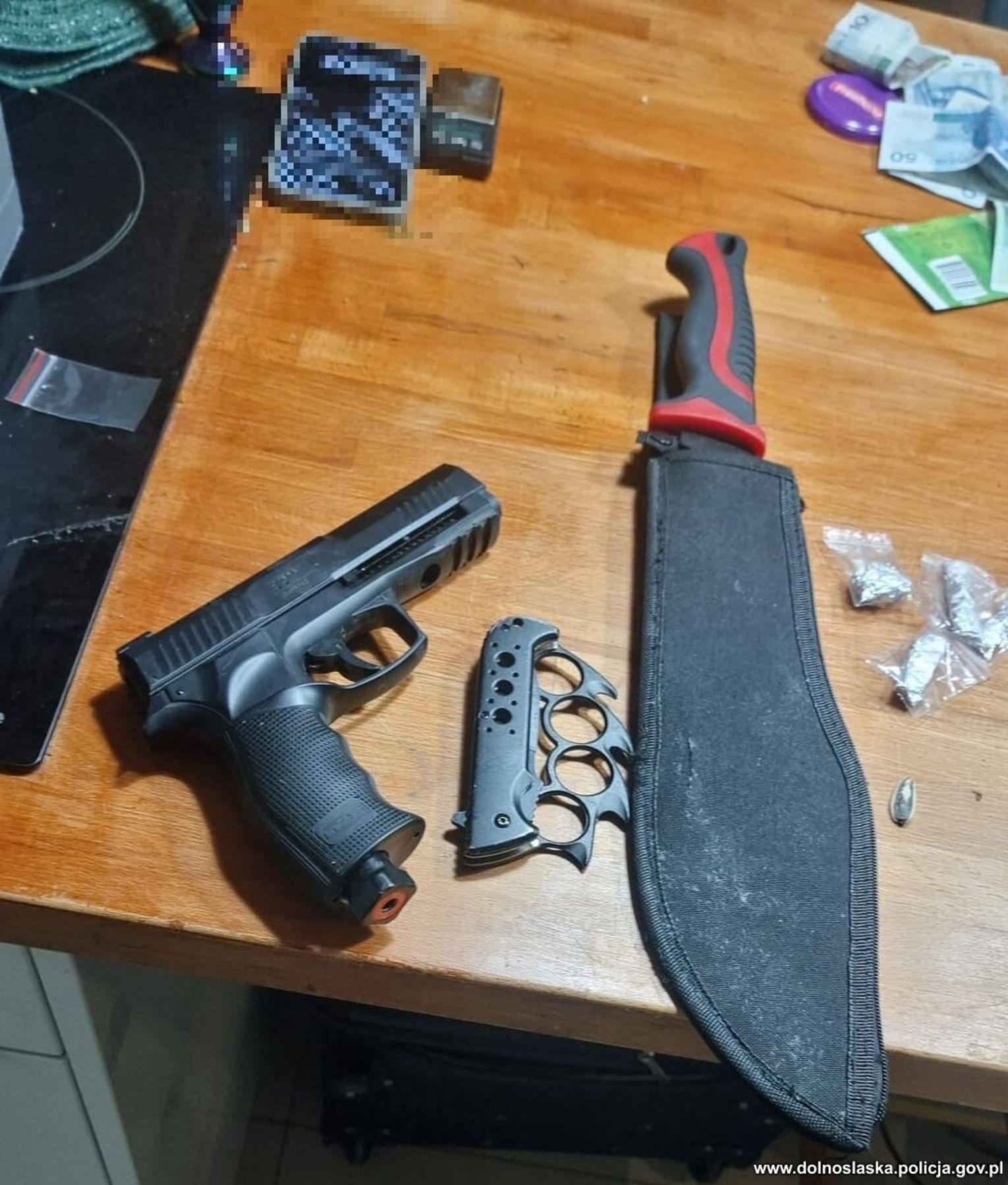 Podczas szczegółowego przeszukania policjanci zabezpieczyli przedmioty, które świadczą o tym, że grupa była przygotowana na ewentualne sytuacje siłowe. W ręce mundurowych wpadły trzy sztuki broni pneumatycznej, maczeta i nóż motylkowy oraz pałki teleskopowe i gazy pieprzowe. Oprócz „arsenału”, funkcjonariusze przejęli profesjonalną zgrzewarkę próżniową, telefony komórkowe oraz 25 tysięcy złotych w gotówce. Łącznie w lokalu zabezpieczono ponad 940 gramów narkotyków (marihuany, mefedronu i metamfetaminy).