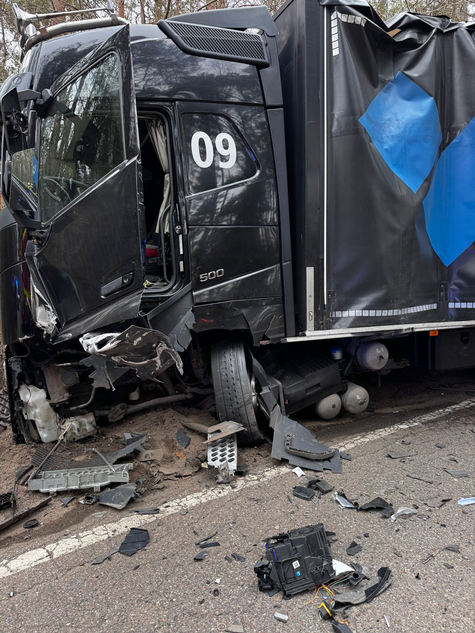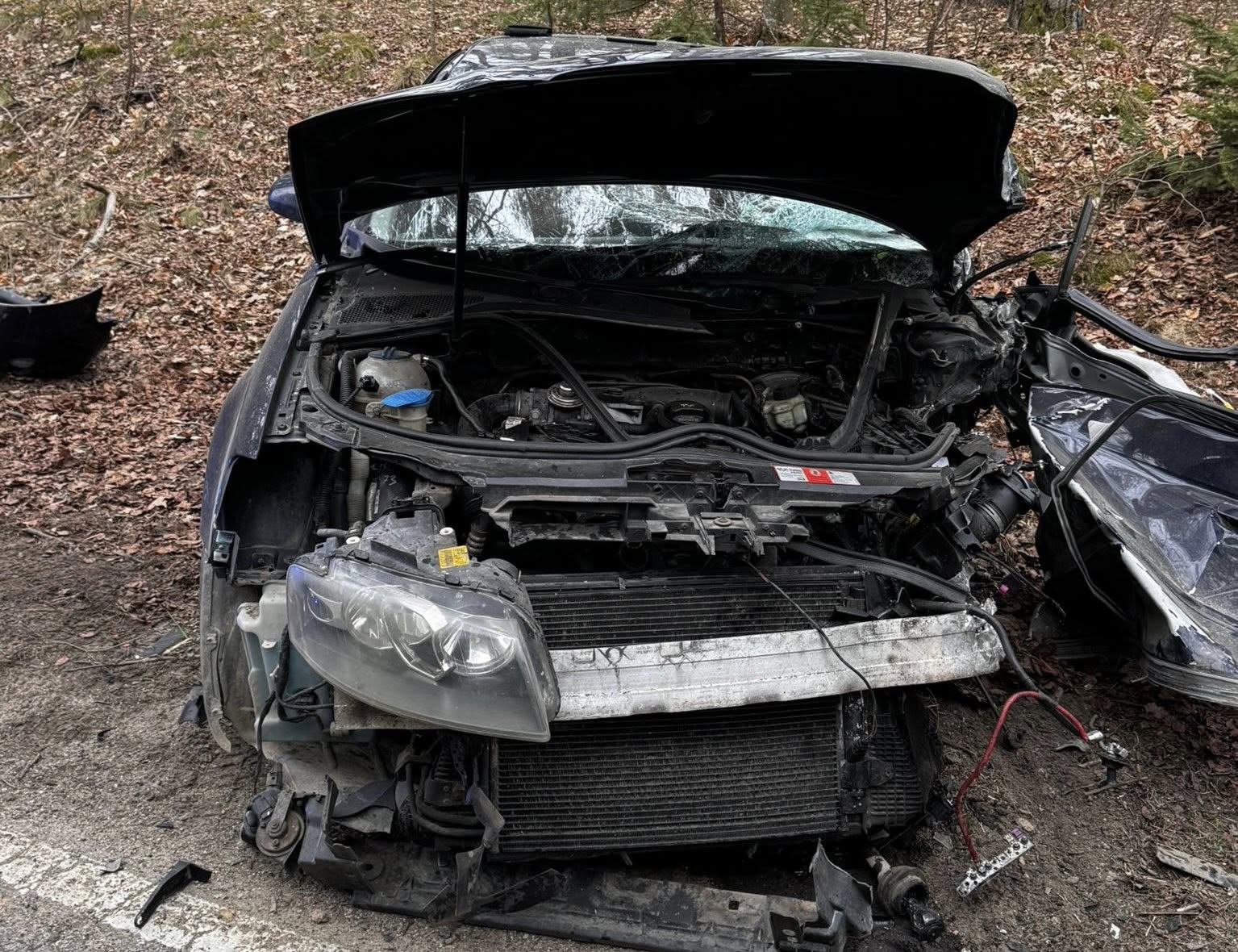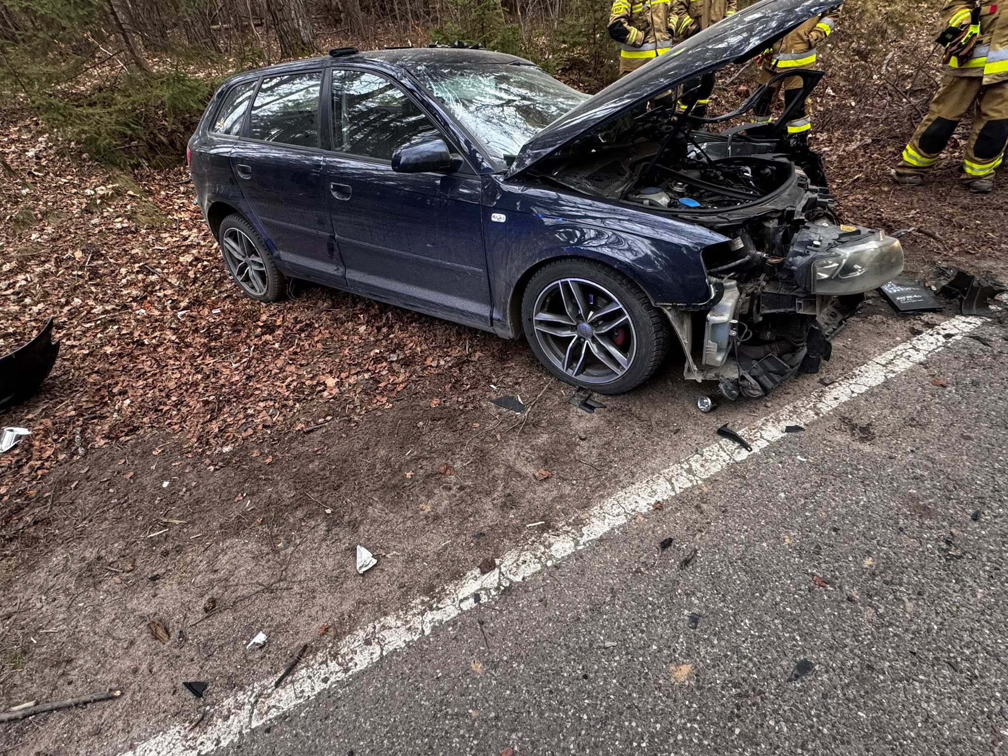 Siła uderzenia była tak duża, że przód Audi został całkowicie zmiażdżony, a kierowca został uwięziony wewnątrz kabiny. Strażacy musieli użyć specjalistycznych narzędzi hydraulicznych, aby rozciąć konstrukcję auta i wydostać mężczyznę. Poszkodowany w stanie nieprzytomnym został niezwłocznie przetransportowany do szpitala. Jego stan określany jest jako ciężki.