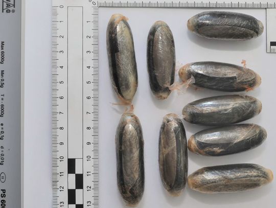 Mężczyzna zachowywał się bardzo nerwowo. Funkcjonariusze nabrali podejrzeń, że może on przemycać narkotyki wewnątrz organizmu. W obliczu zagrożenia życia i zdrowia, pasażer przyznał się do winy, wyznał, że połknął jeszcze 88 kapsułek. 40-latek natychmiast trafił do szpitala. Badanie tomografem komputerowym potwierdziło, że jego układ pokarmowy jest wypełniony narkotykami. Łącznie funkcjonariusze zabezpieczyli 89 kapsułek o wadze prawie 0,8 kg. Czarnorynkowa wartość tej ilości kokainy to blisko 300 tysięcy złotych.