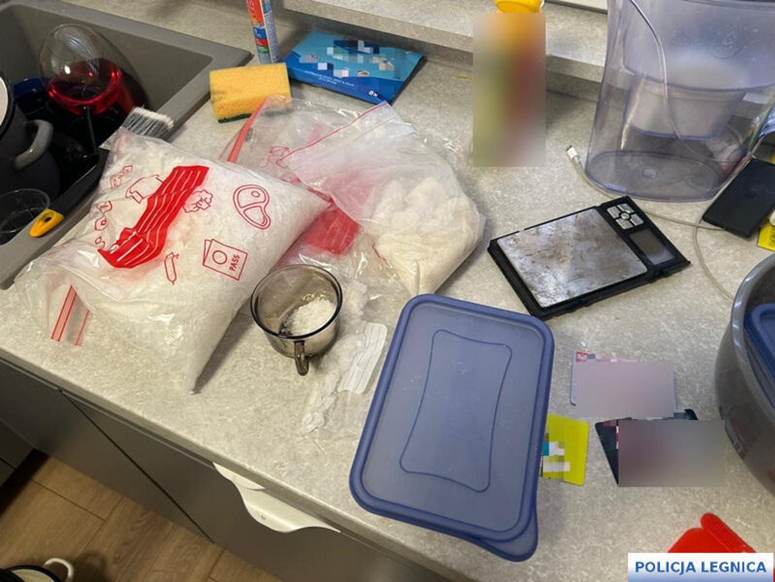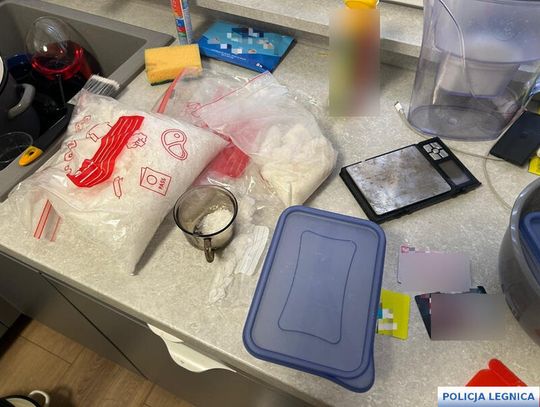 Równolegle policjanci uderzyli w kolejne lokalizacje w Legnicy oraz Lubinie. Tam zabezpieczono telefony, dokumentację oraz sprzęt do porcjowania gotowego towaru. Przejęto 12 kilogramów metamfetaminy o czarnorynkowej wartości blisko 1 miliona złotych, 45 tysięcy złotych w gotówce, dwa samochody (Mercedes i Skoda) warte 140 tysięcy złotych oraz setki litrów chemikaliów i prekursory do produkcji narkotyków.
