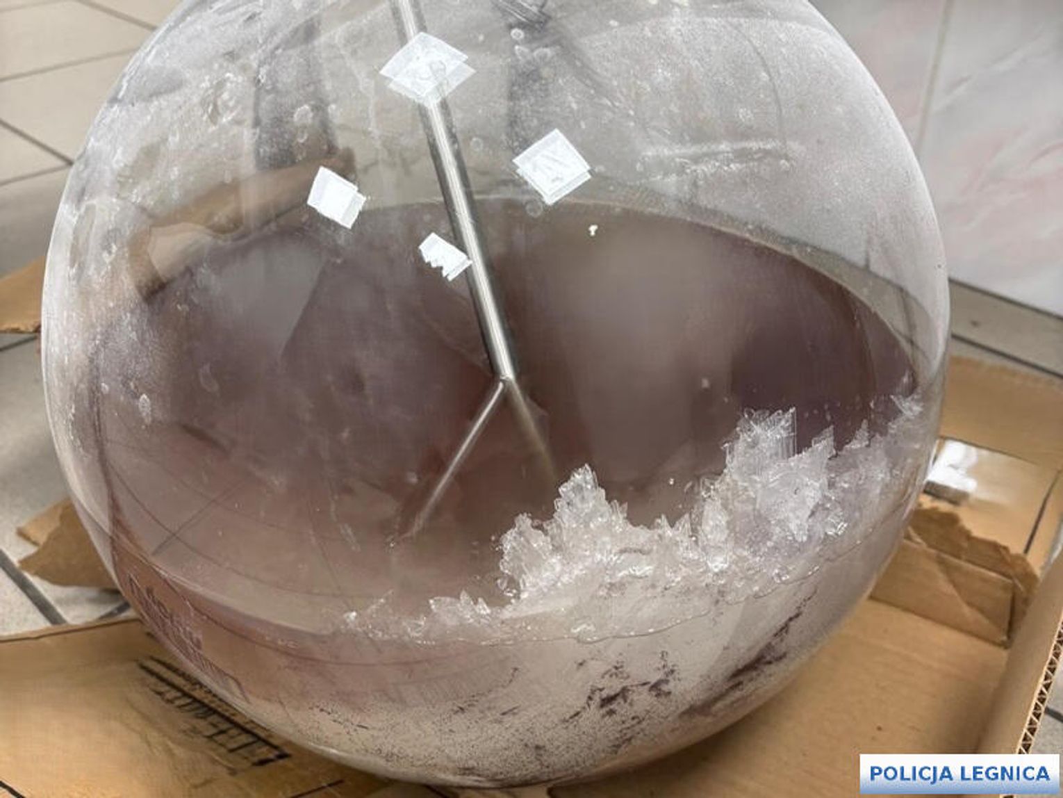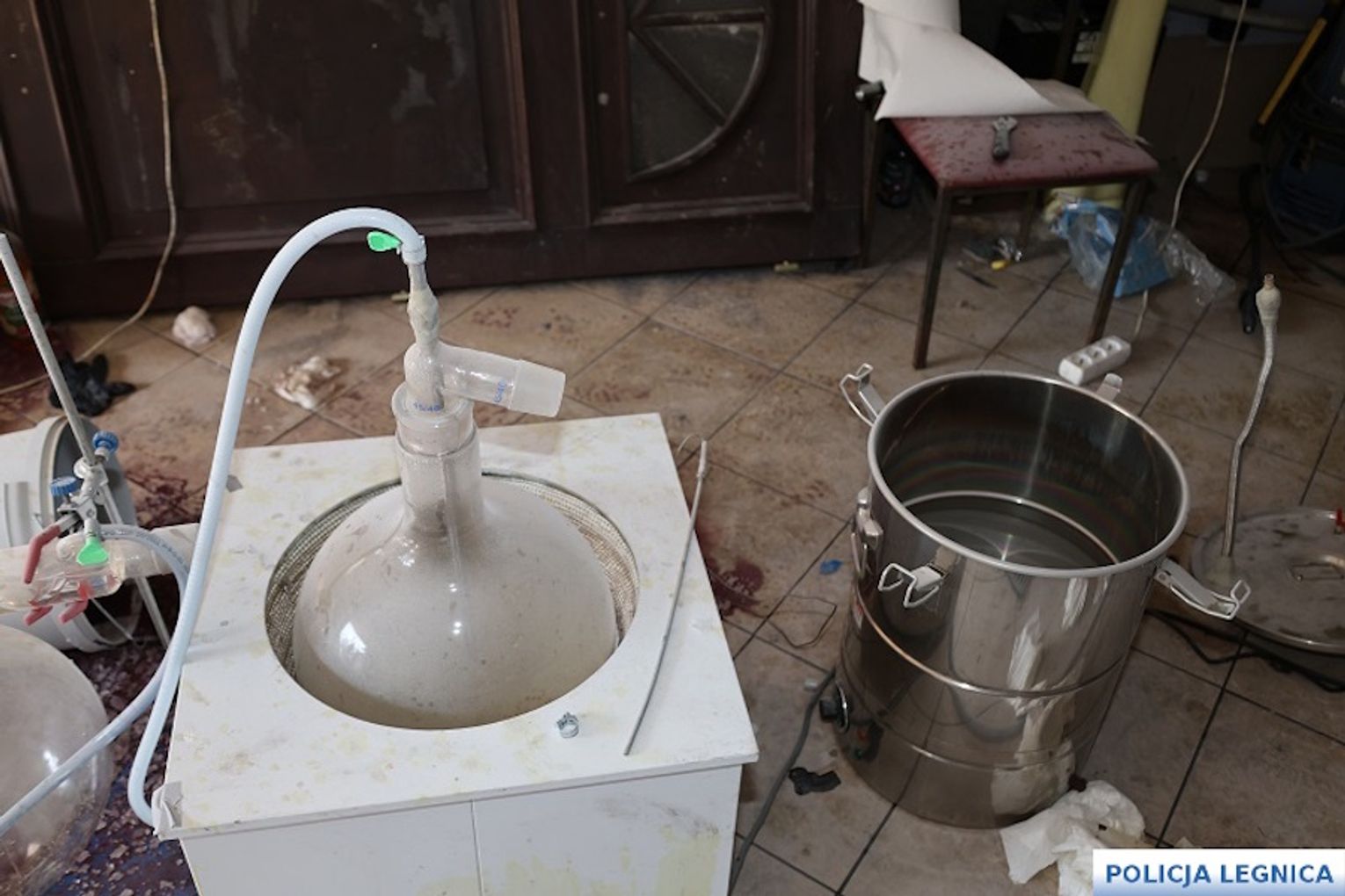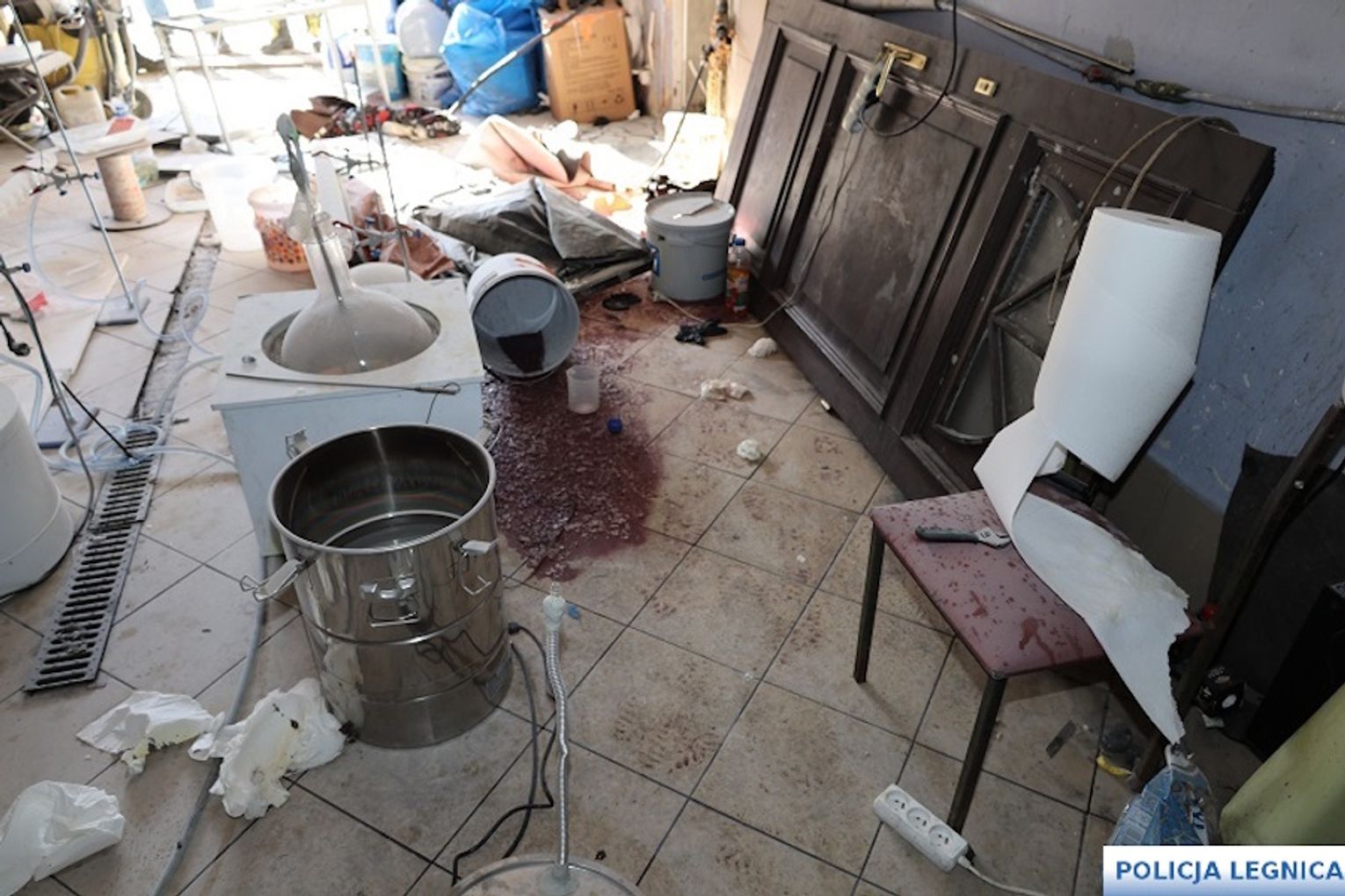 Kiedy policjanci wkroczyli na wytypowaną posesję, dwóch mężczyzn zostało zatrzymanych na gorącym uczynku. Wewnątrz budynku funkcjonariusze zastali aktywną linię produkcyjną. W powietrzu unosił się duszący zapach odczynników, a profesjonalna aparatura, m.in. kolby, pipety i naczynia żaroodporne pracowała pełną parą.
